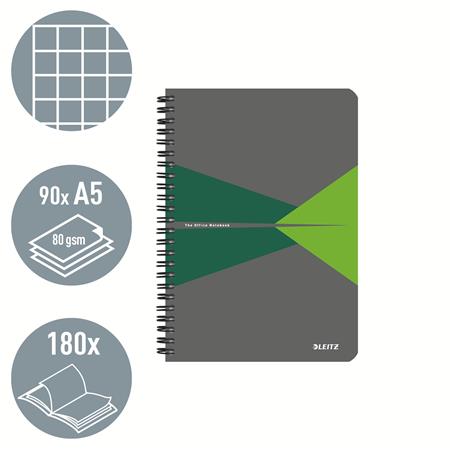 Spirálfüzet, A5, kockás, 90 lap, PP borító, LEITZ "Office", szürke-zöld